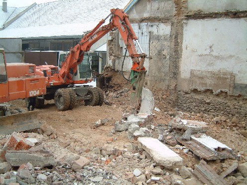 Schwere Baumaschinen brechen das Mauerwerk ein.