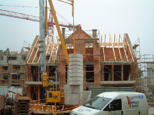 Nach dem Hochmauern der Stockwerke wird der Dachstuhl errichtet. Der komplette Bau wird mit Schutzgeruest versehen.